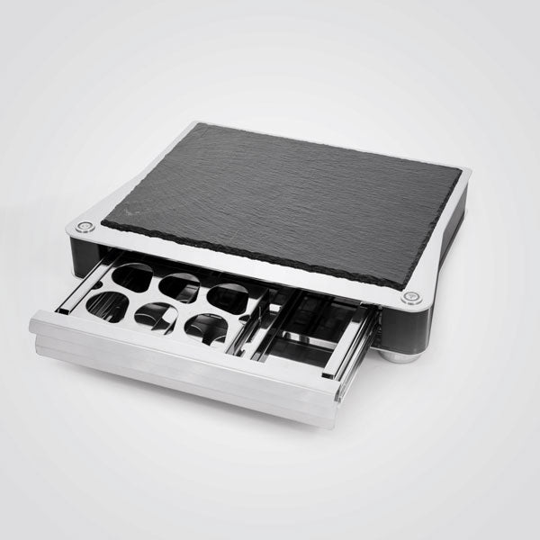 Kaffeestation: das ultimative Zubehör für Ihre FlyTek-Einzelgruppenmaschine. Es ist viel mehr als eine einfache Kommode, denn es integriert auch einen praktischen oberen Tassenwärmer in Slate Rock, programmierbar per Smartphone.