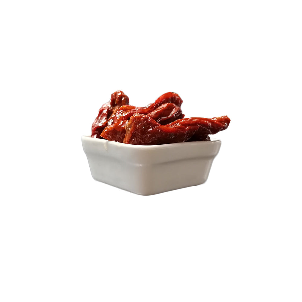 Pomodori essiccati lentamente al sole, insaporiti con aglio e origano e colmati in olio di oliva.